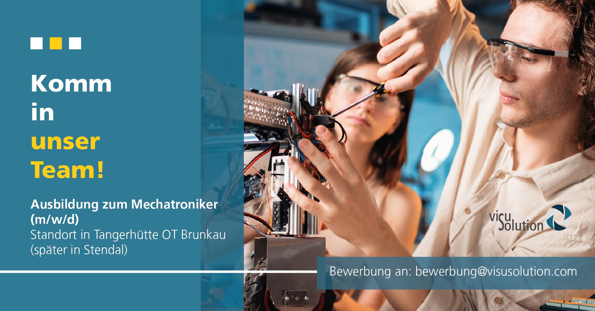 Wenn du gern deinen Weg in einem erfolgreichen und innovativen Unternehmen starten möchtest, dann freuen wir uns auf deine Bewerbung. Sende uns deine vollständigen Bewerbungsunterlagen -vorzugsweise per E-Mail- an: bewerbung@visusolution.com oder an visuSolution GmbH, z.Hd. Frau de Beaux, Otto-von-Guericke-Str. 65, 39104 Magdeburg.