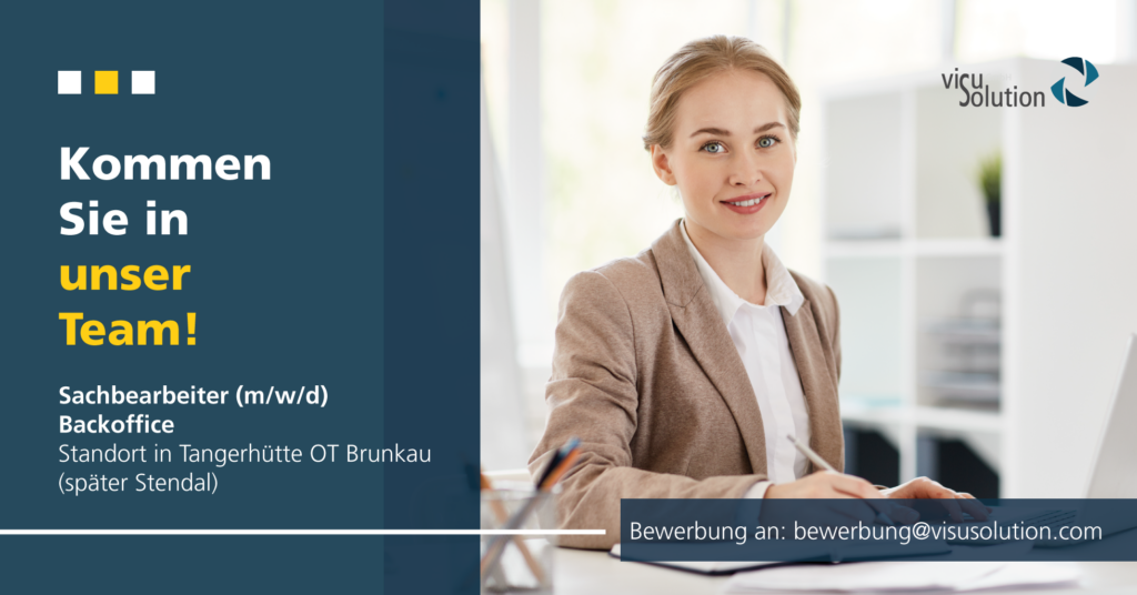 Senden Sie uns bitte Ihre vollständigen Bewerbungsunterlagen mit Angabe Ihrer Gehaltsvorstellung und Verfügbarkeit -vorzugsweise per E-Mail- an: bewerbung@visusolution.com oder an visuSolution GmbH, z.Hd. Frau de Beaux, Otto-von-Guericke-Str. 65, 39104 Magdeburg.